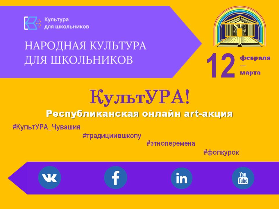 Чувашская республиканская детско-юношеская библиотека завершила республиканскую онлайн art-акцию «КультУРА!», которая проходила в рамках Всероссийского проекта «Народная культура для школьников» и приурочена к 85-летию со дня образования Министерства культуры, по делам национальностей и архивного дела Чувашской Республики.